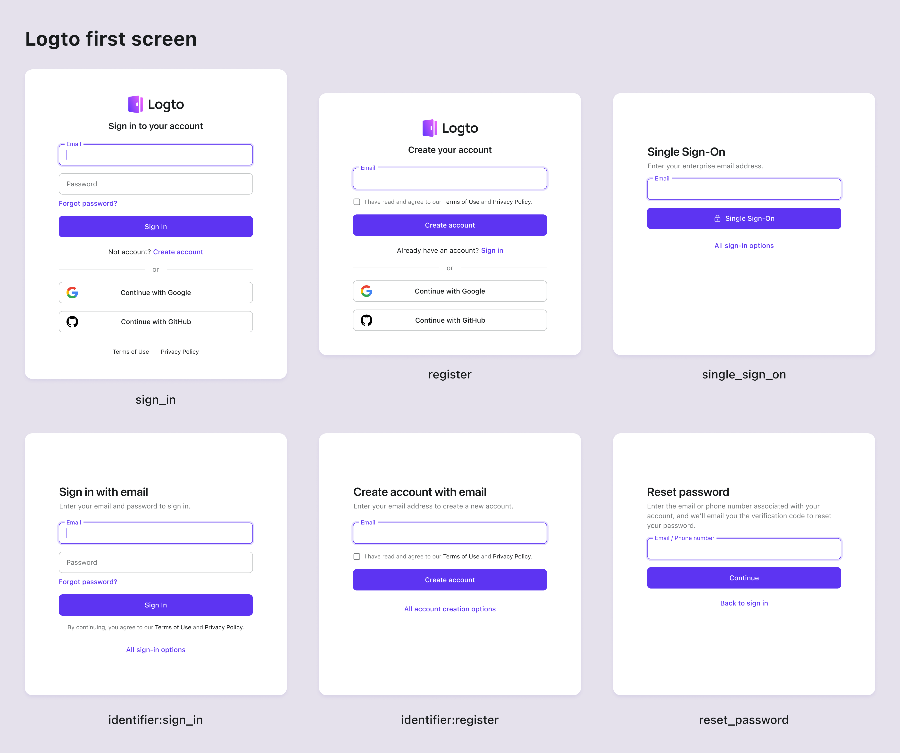 The first_screen parameter is the key parameter that determines the first screen that the users will see when they redirect to the Logto's sign-in page. By default, the universal sign-in form will be displayed. Use this parameter to customize the first screen based on your application's requirements. Supported values are: